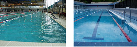 25-метровые бассейны («короткая вода») – это обычно спортивные сооружения районного масштаба, тогда как на «длинной воде», в 50-метровых бассейнах, проводятся основные соревнования.
