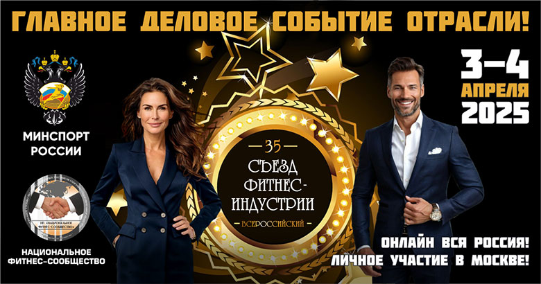 3-4 апреля 2025 года вся фитнес-отрасль России встретится на Главном Деловом Событии с богатой 18-летней историей успеха — 35 Юбилейном Всероссийском Съезде Фитнес-Индустрии!